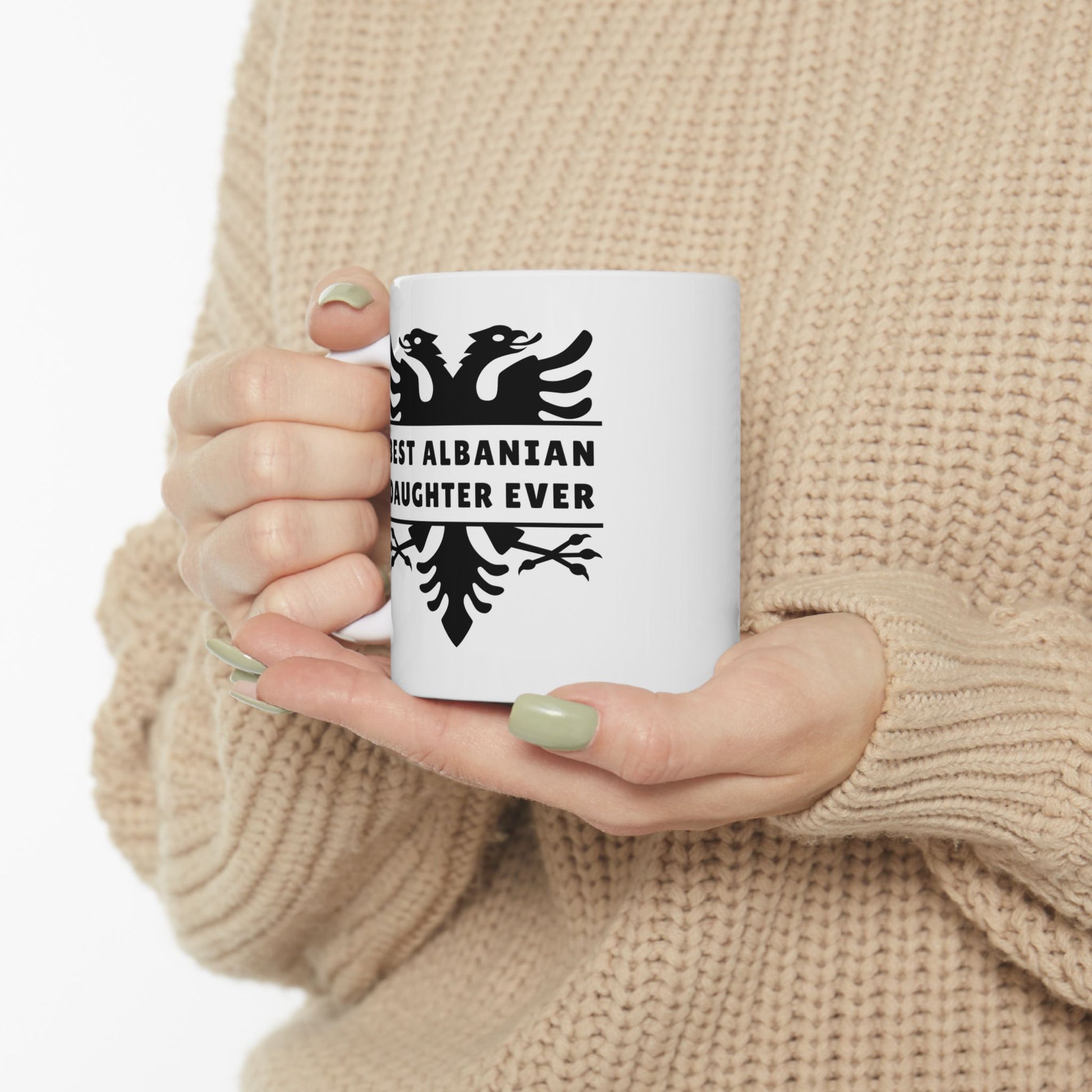 Celebrate your daughter with a daily reminder of just how amazing she is. This Best Albanian Daughter Ever mug combines heartfelt love with national pride, featuring a clean white ceramic base and a bold black Albanian eagle design. Whether she’s sipping tea, coffee, or hot cocoa, this 11 oz mug is a cozy tribute to who she is and where she comes from.