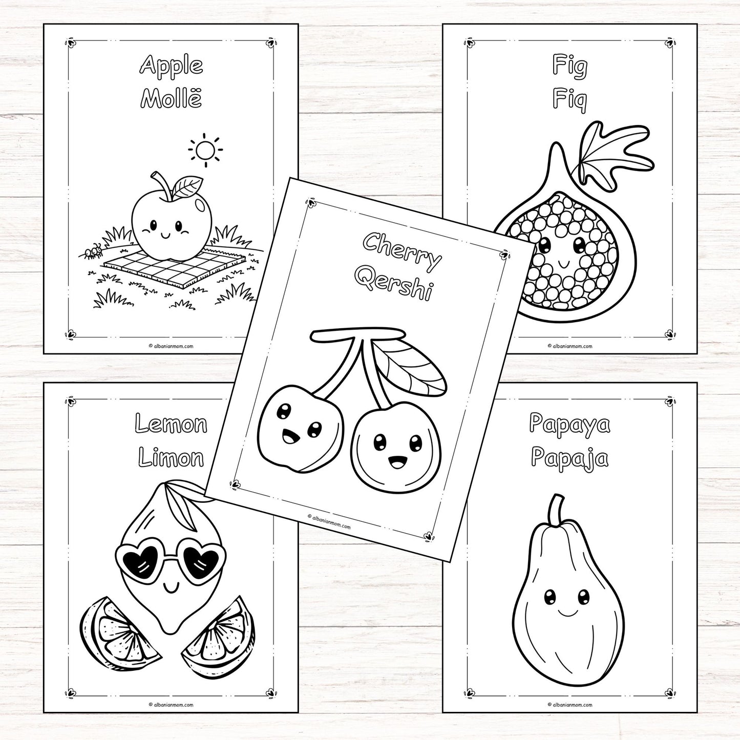 Each of the 30 pages features one delicious fruit with its name in both English and Albanian, alongside a bold, kid-friendly illustration ready to be brought to life with color. From apples to lychees, this fun printable is perfect for bilingual families, young language learners, and curious little artists.