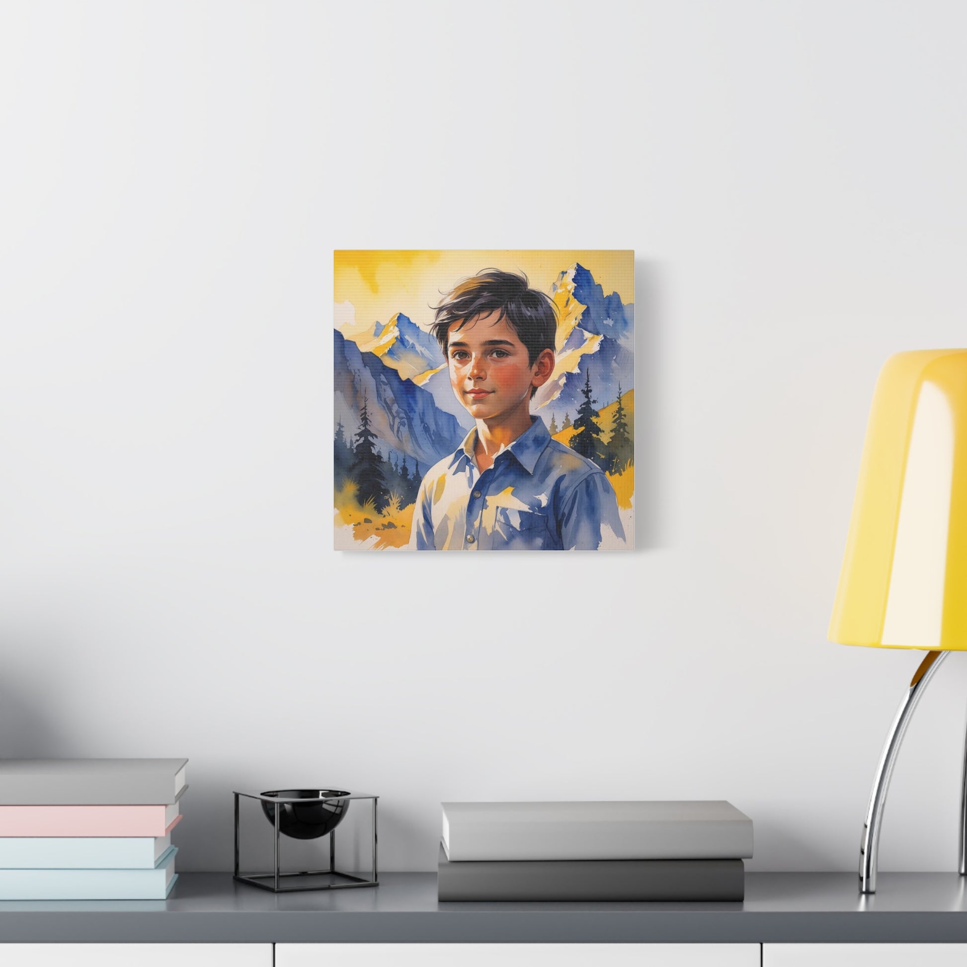“Dardan’s Freedom Dream” is a moving and luminous watercolor style canvas portrait that captures the quiet hope of a young Kosovar shepherd boy standing tall against the dramatic beauty of the Accursed Mountains (Bjeshkët e Nemuna).