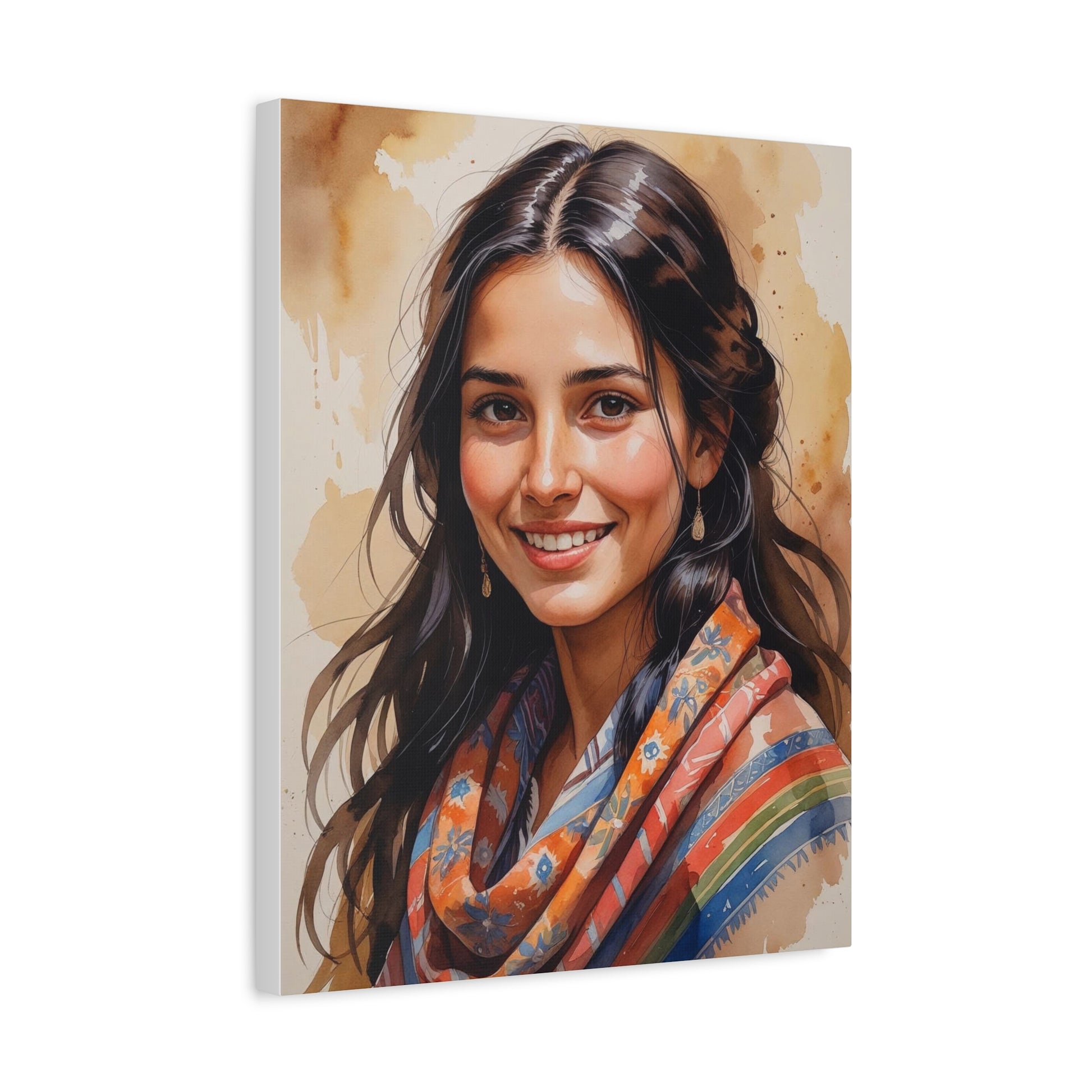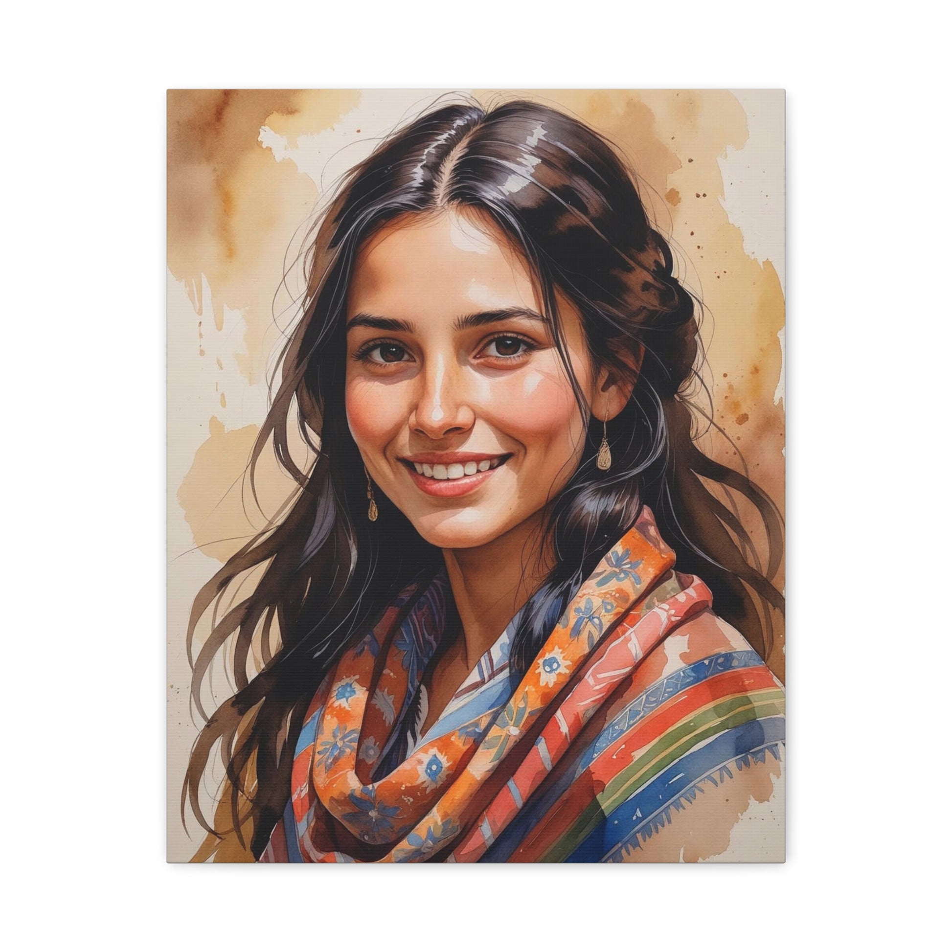“Papusha: Spirit of the Balkan Wind” is a tender and evocative watercolor-style canvas print capturing the warmth, beauty, and cultural depth of a young Romani woman named Papusha—a name meaning “doll” in the Romani language, a tribute to her grace and luminous spirit.