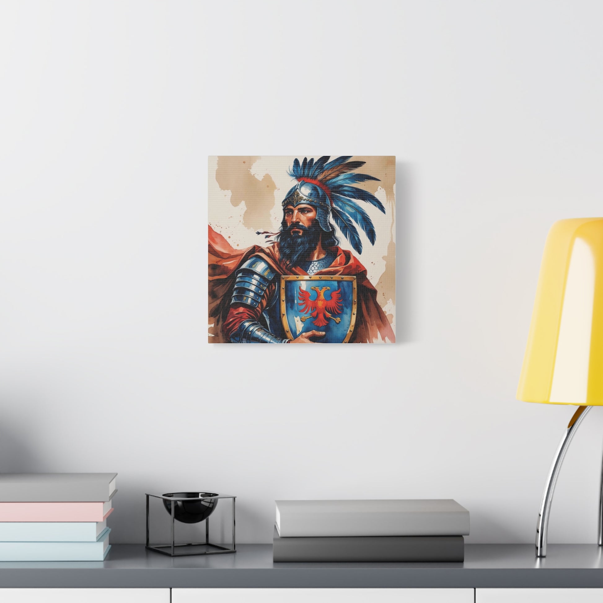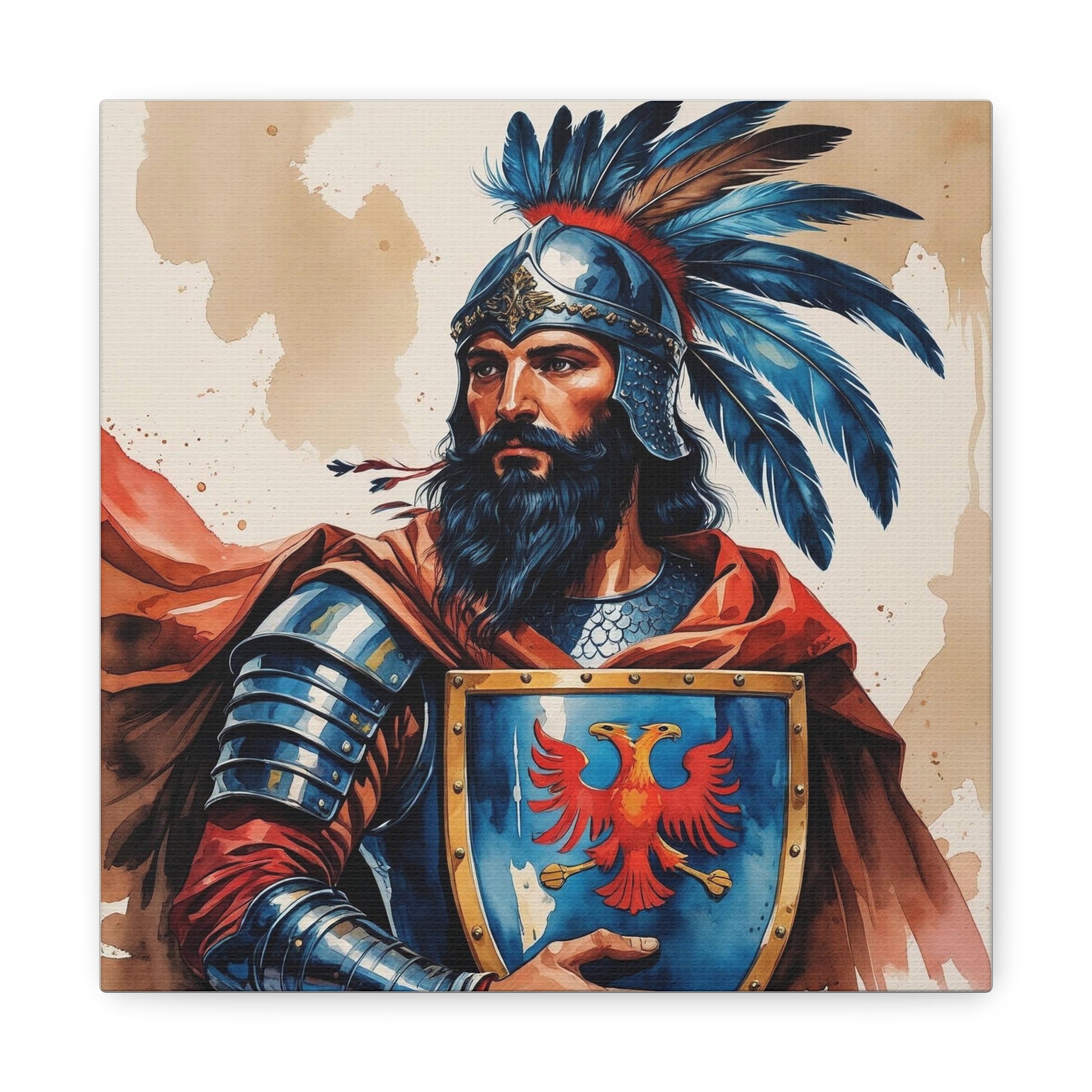 “Skanderbeg: Guardian of the Eagle” is a powerful and reverent watercolor canvas honoring Gjergj Kastrioti Skënderbeu, Albania’s most celebrated historical figure. This striking portrait captures him in full regalia — a majestic warrior cloaked in flowing red, his gleaming helmet crowned with proud white feathers, and his long, dark beard framing a face of unyielding strength and vision.