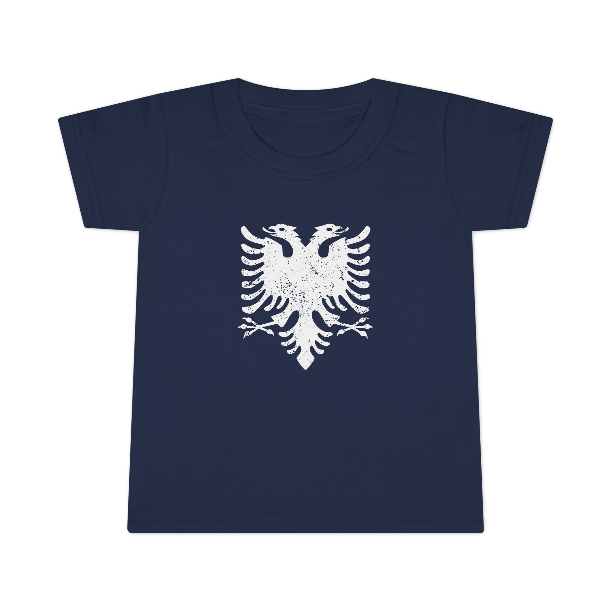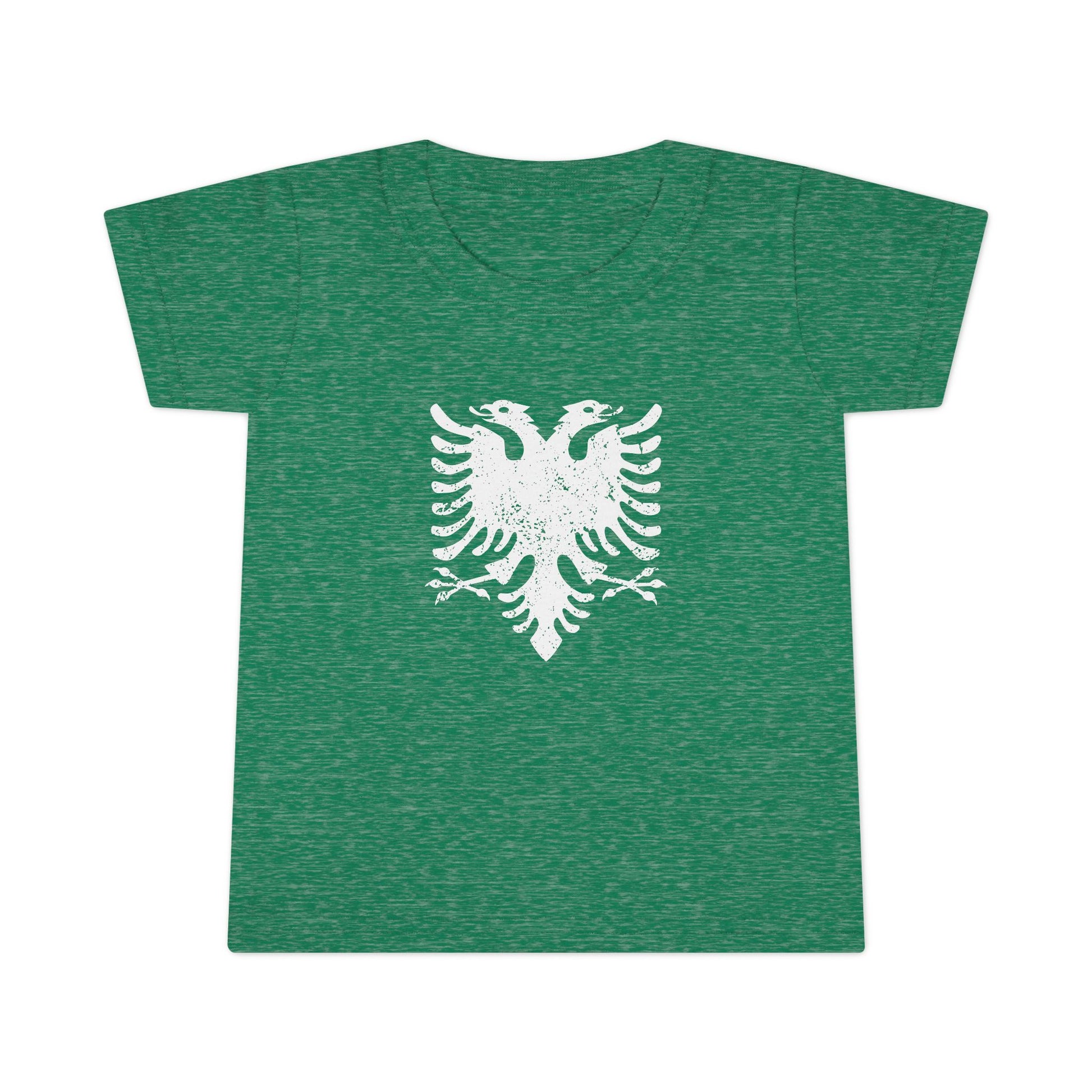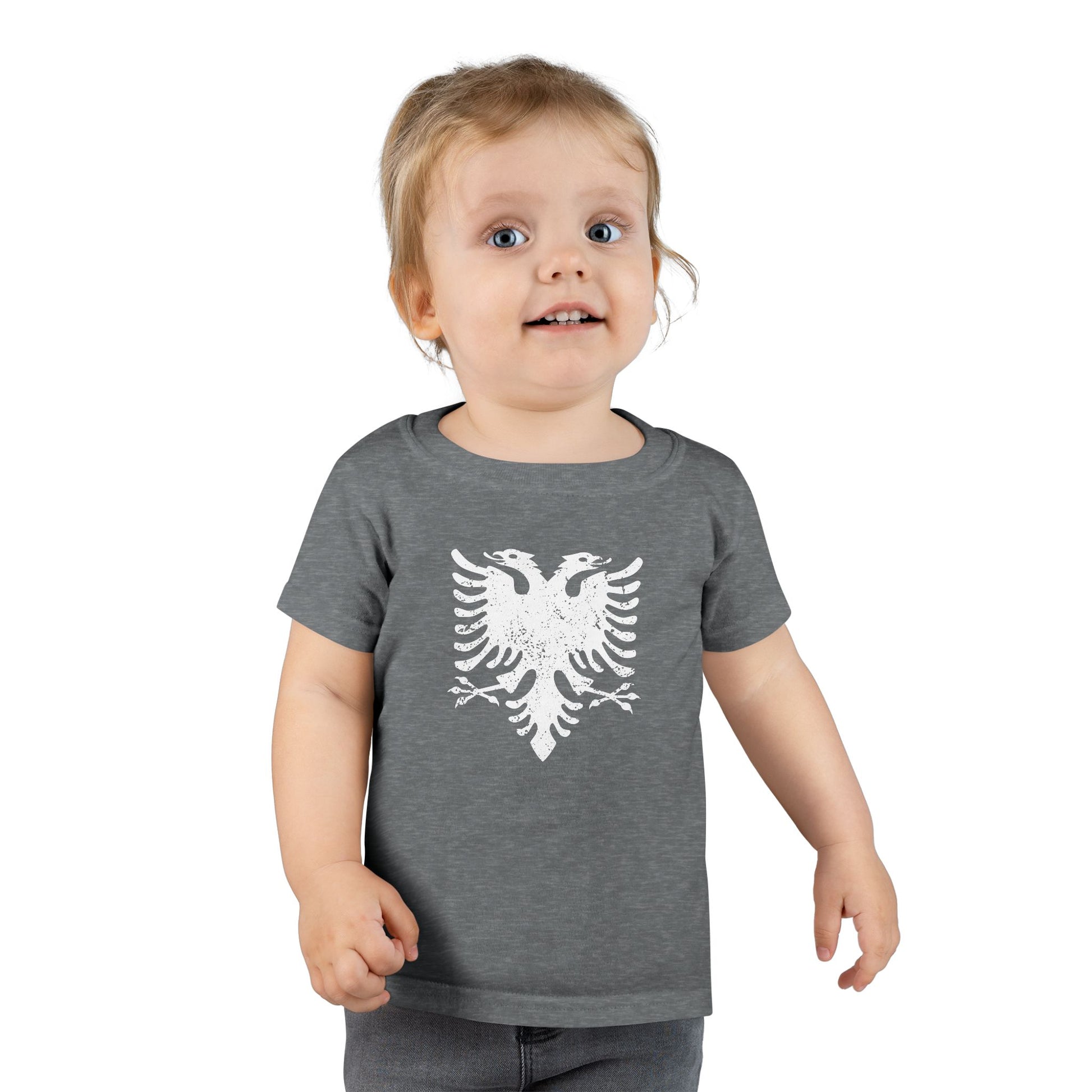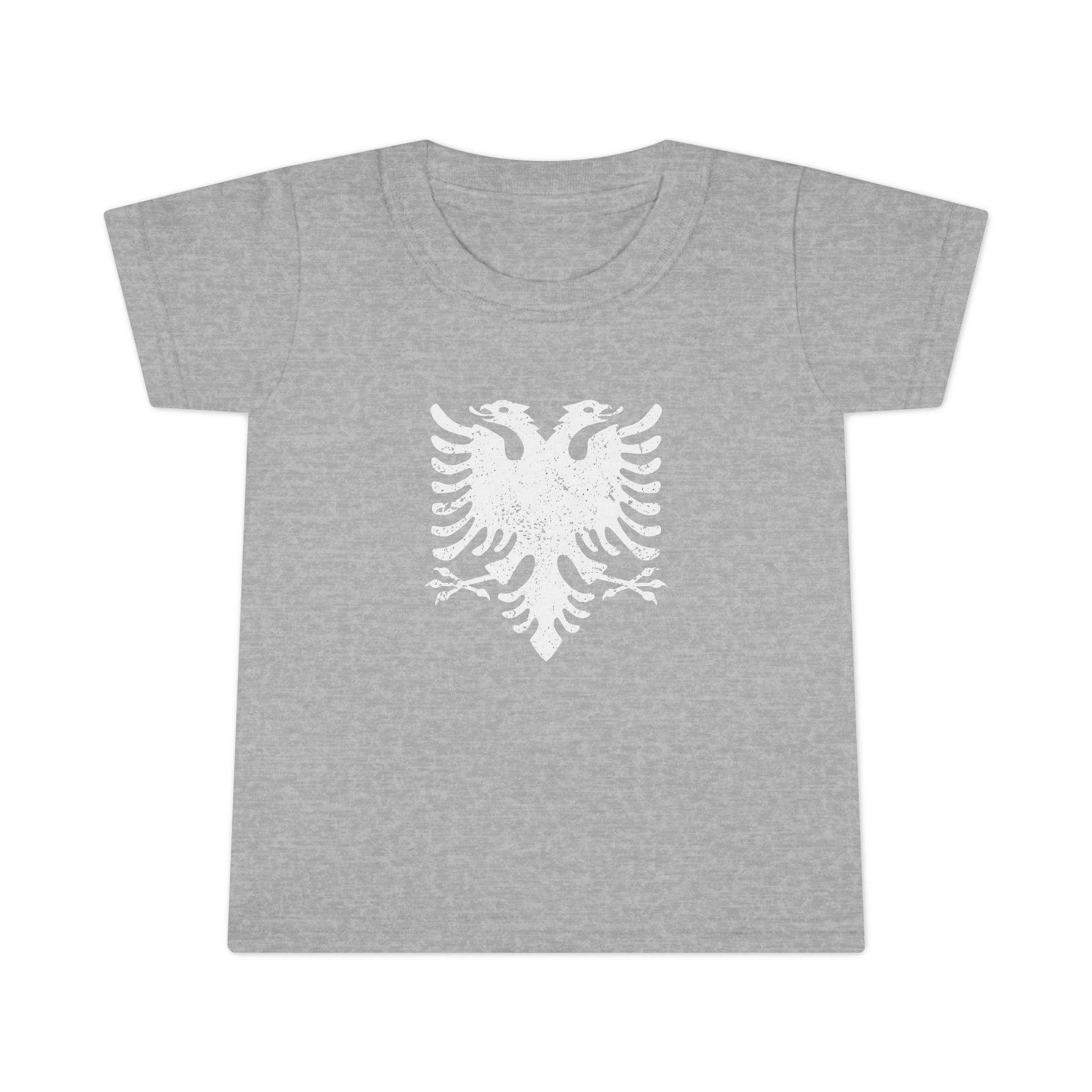 Let your little one stand tall in style with this Toddler Eagle Graphic T-Shirt, featuring a bold white distressed Albanian eagle front and center. This timeless design celebrates strength, culture, and identity—shrunk down to toddler size and made extra cute.