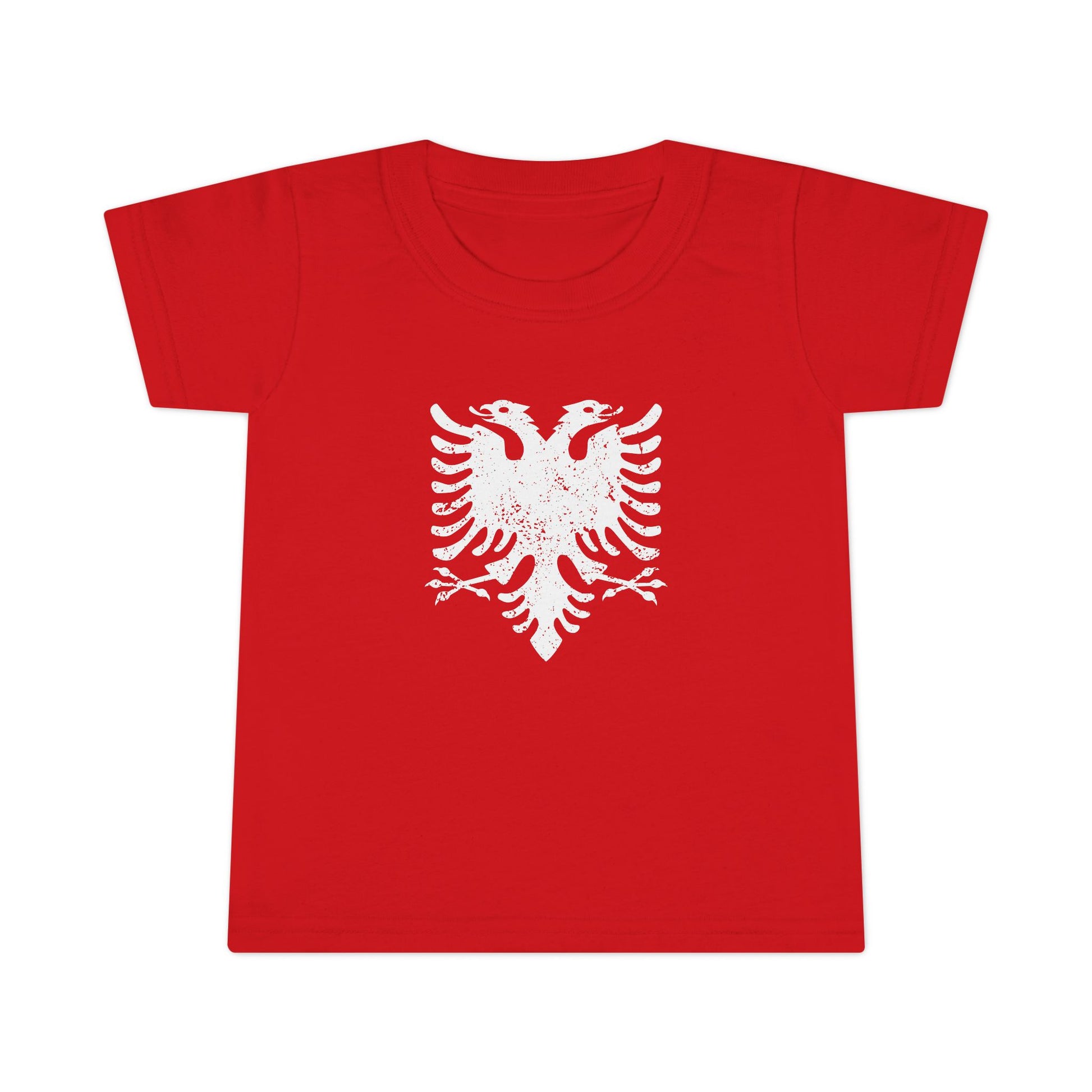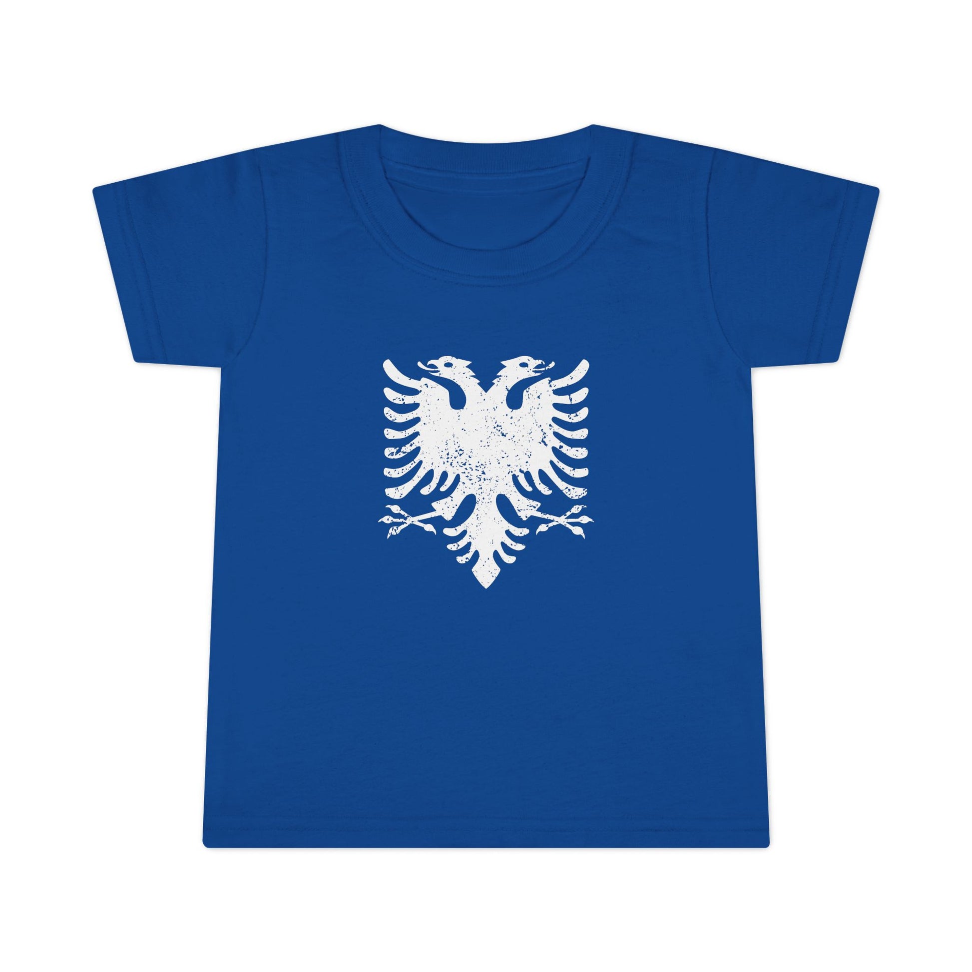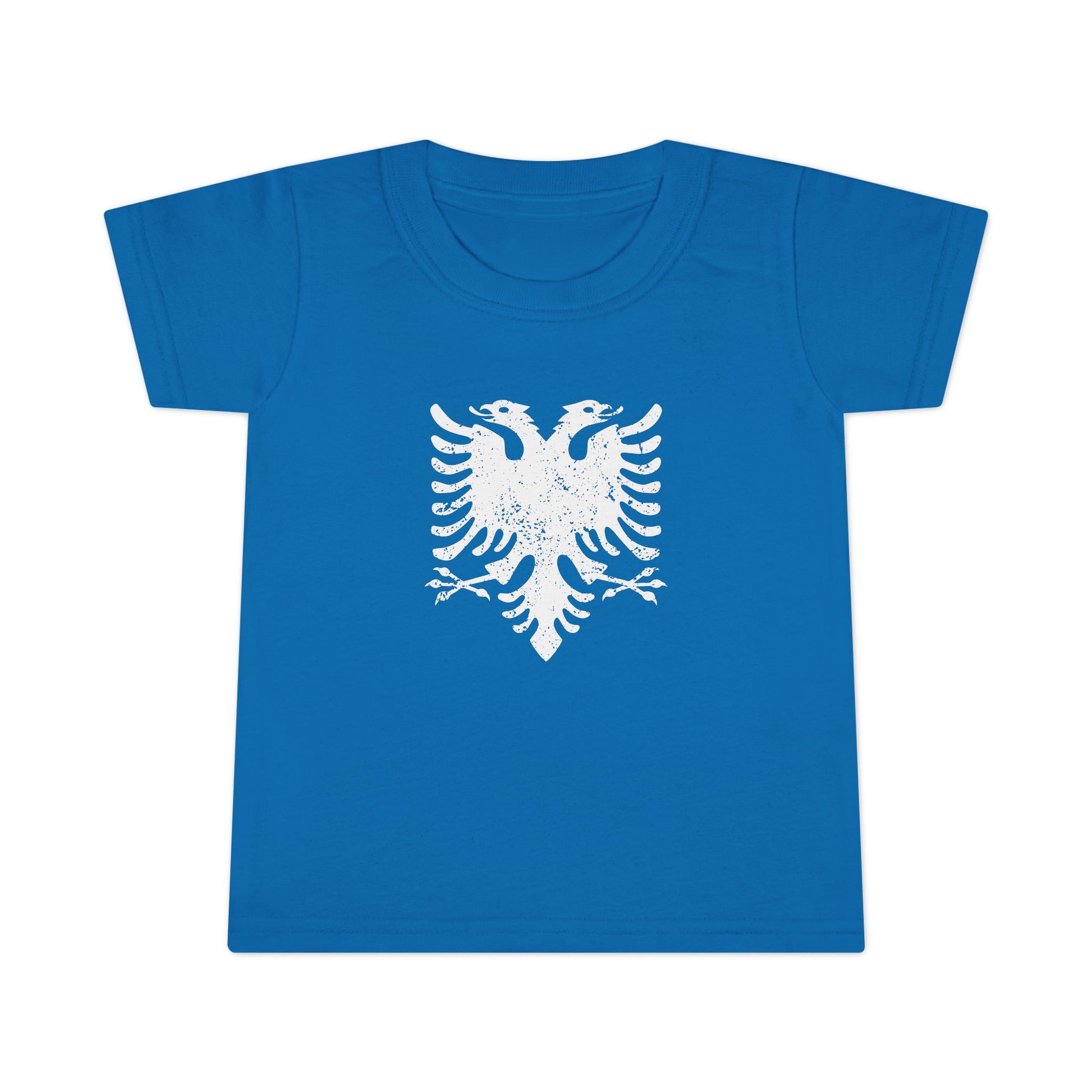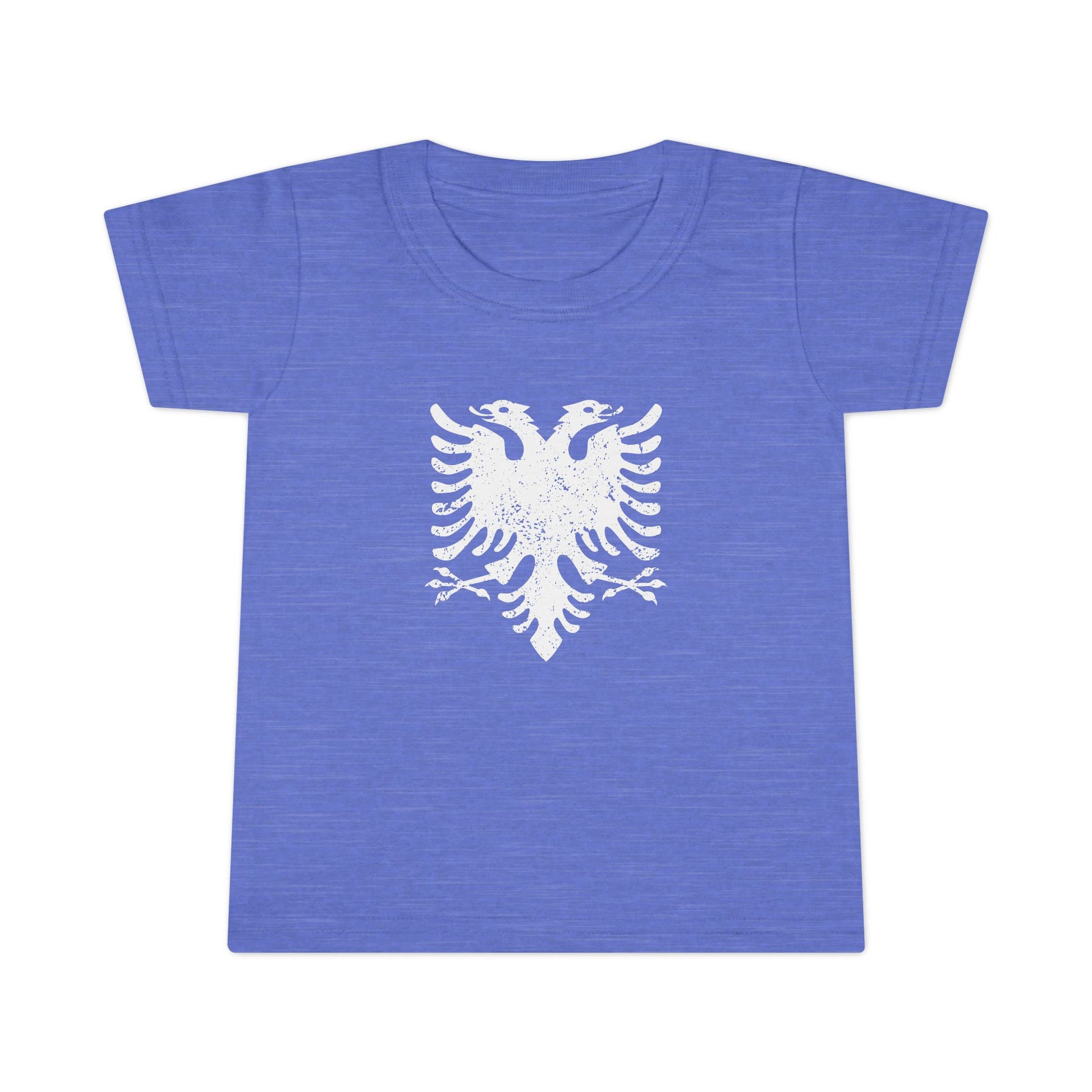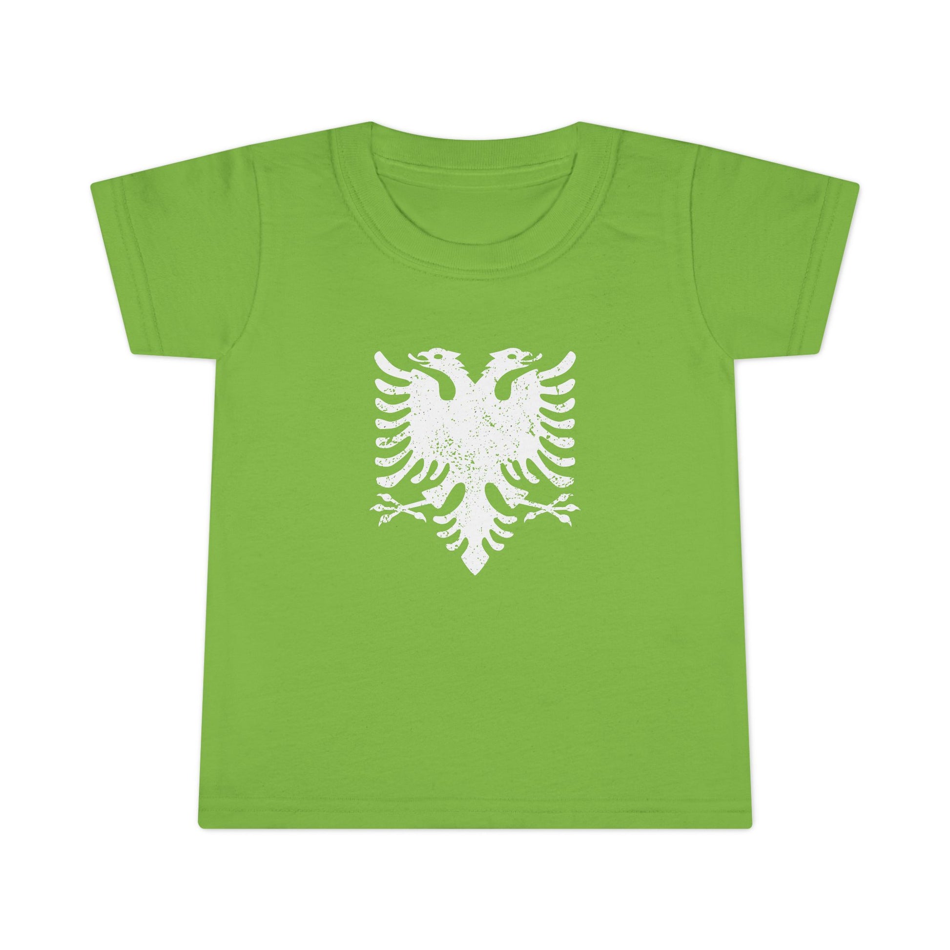 Let your little one stand tall in style with this Toddler Eagle Graphic T-Shirt, featuring a bold white distressed Albanian eagle front and center. This timeless design celebrates strength, culture, and identity—shrunk down to toddler size and made extra cute.