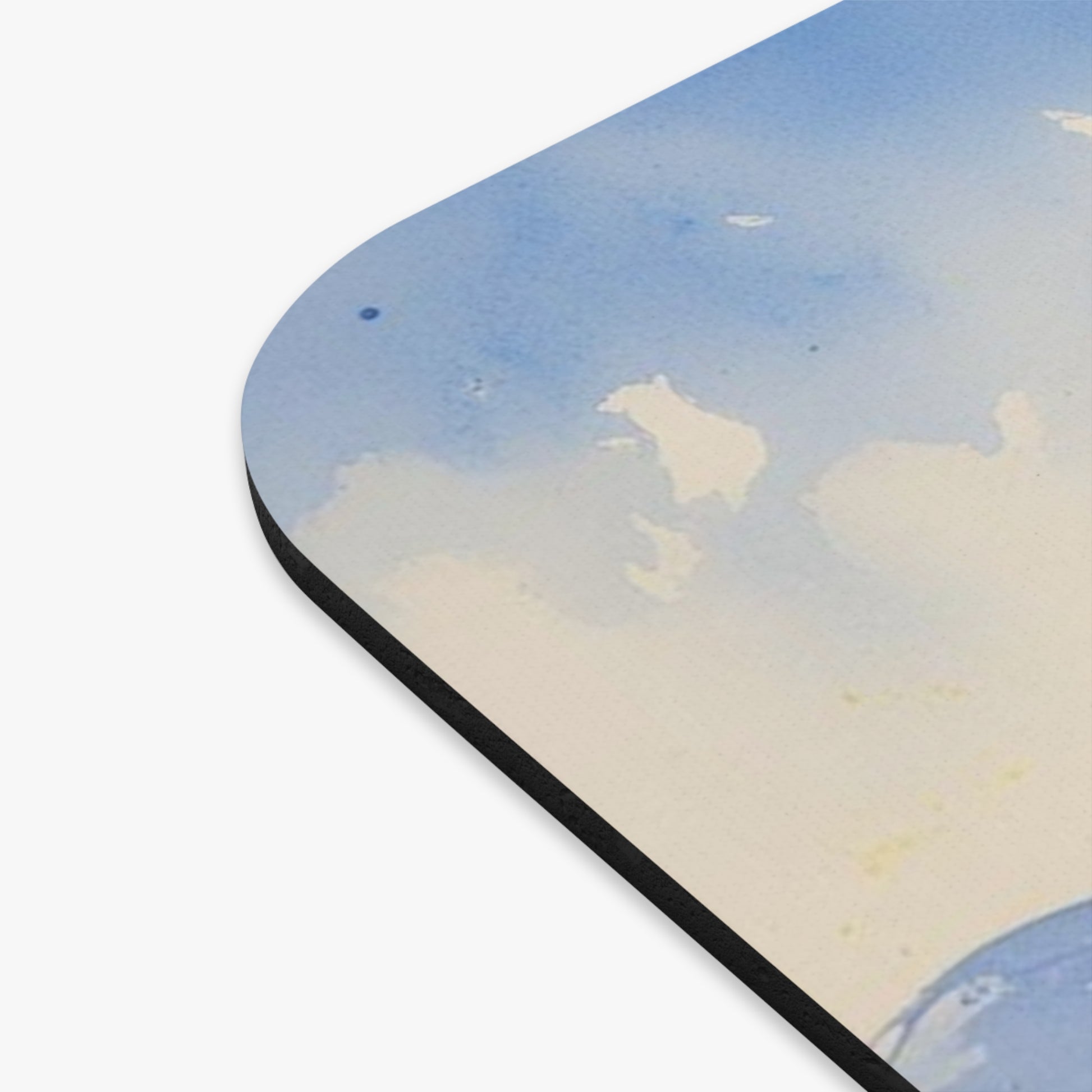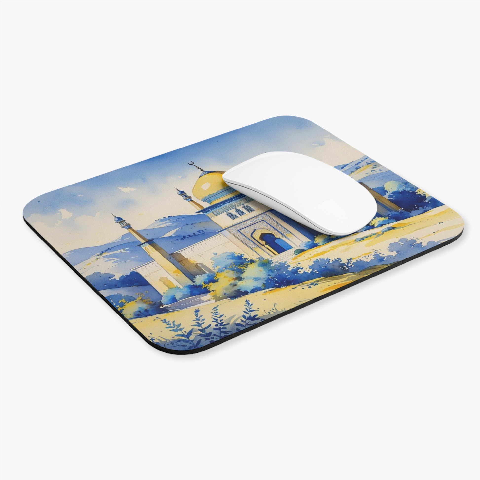 Bring meaning and beauty to your desk with this 9"x8" mouse pad featuring a serene watercolor of a Sufi temple inspired by Kosovo. Painted in soft blue and yellow hues, this design echoes the spirit of Sufism and the colors of the Kosovo flag. The artwork draws from traditional Persian miniature styles, with fine architectural details and graceful natural scenery.